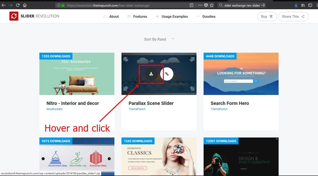 Firstly, start downloading the slider templates. Secondly, hover over the slider of your choice, then click the Download link. A .zip file containing the demo slider will be downloaded to your computer.